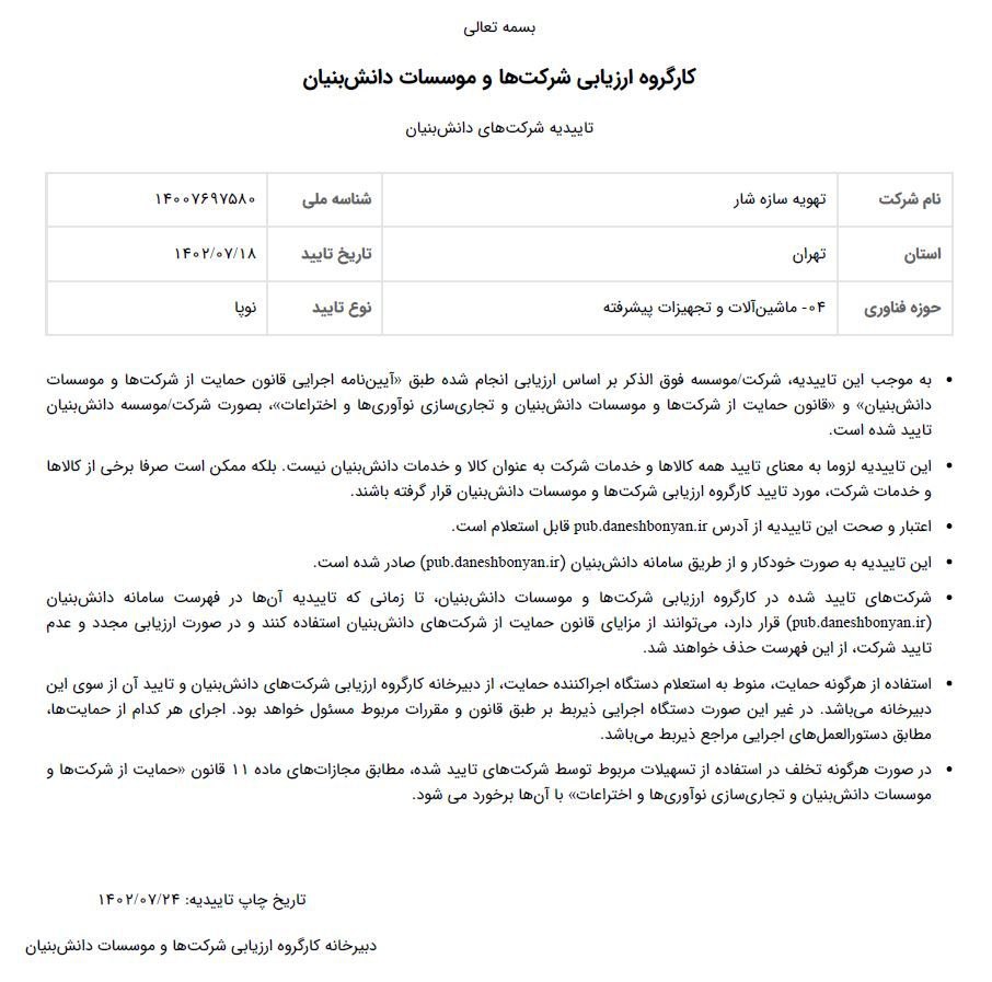 گواهی دانش بنیانAdminventبهمن ۱۰, ۱۴۰۲شرکت تهویه سازه شار بابت تولید محقول دمپر ضد انفجار، به عنوان اولین مجموعه در ایران موفق به اخذ گواهی ... ادامه مطلب